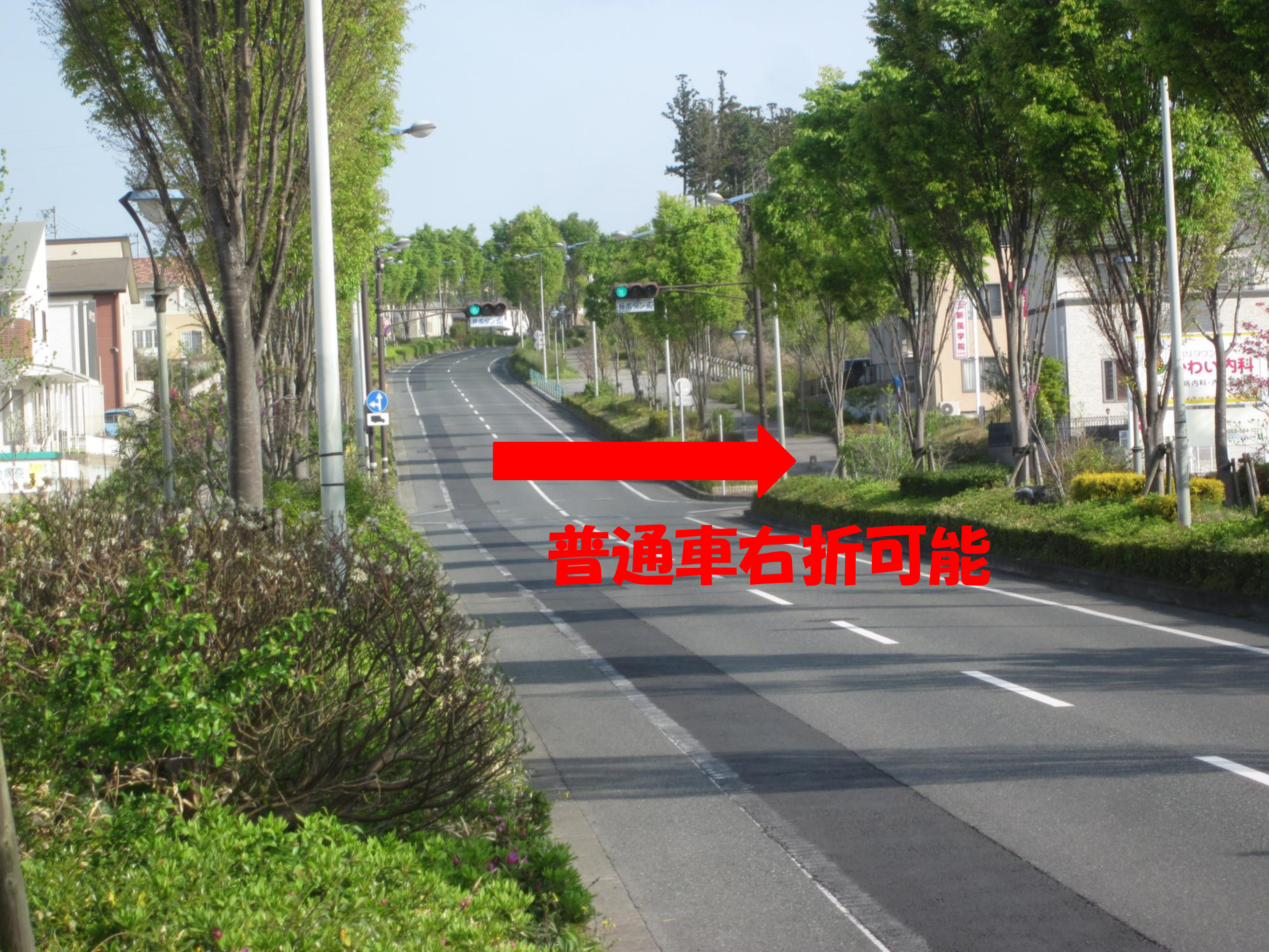 メイン通りからは、普通車であれば押しボタン信号の交差点で右折・左折ともに可能です。